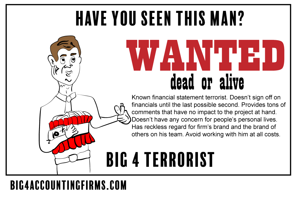 If you have worked at PwC, Deloitte, KPMG or EY, you have worked with this type of person. The financial statement terrorist. The person that cannot let a financial statement, tax return or client proposal go out the door without having their impact. I call them terrorists not to make light of terrorism but
